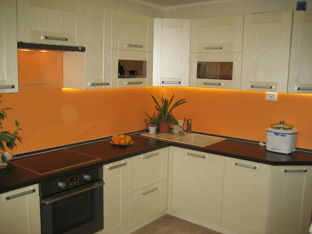 Допустим, вы уже подобрали черную столешницу и оранжевый гарнитур. Какой в этом случае должна быть отделка стен, пола и потолка? Чтобы не получить избыток цвета, лучше сделать светлую неяркую отделку. Стены могут быть матового персикового оттенка. Для потолка подойдет белый цвет, а для пола – мраморный черный.