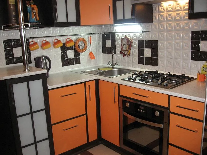 Кухонный фартук. Его можно сделать целиком оранжевым, но только при условии, что этот цвет не доминирует в интерьере. В качестве материала для отделки можно применять стекло, плитку, керамику или даже кирпич. Весьма интересное решение – оранжево-черный фартук из мозаики.
