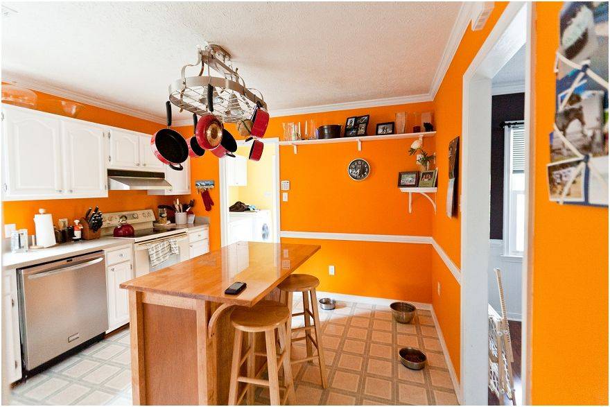 Можно попробовать и частичную окраску стен. Например, до уровня фартука либо обеденного стола. Опять же верх отдайте под белый, серый или любой другой спокойный оттенок. В результате даже очень тесное помещение будет казаться просторнее — и оранжевый цвет ничуть не будет этому помехой.