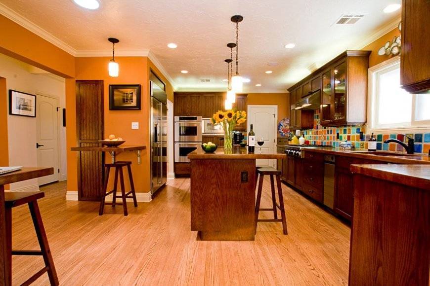 Дерево и оранжевый цвет в большой просторной кухне