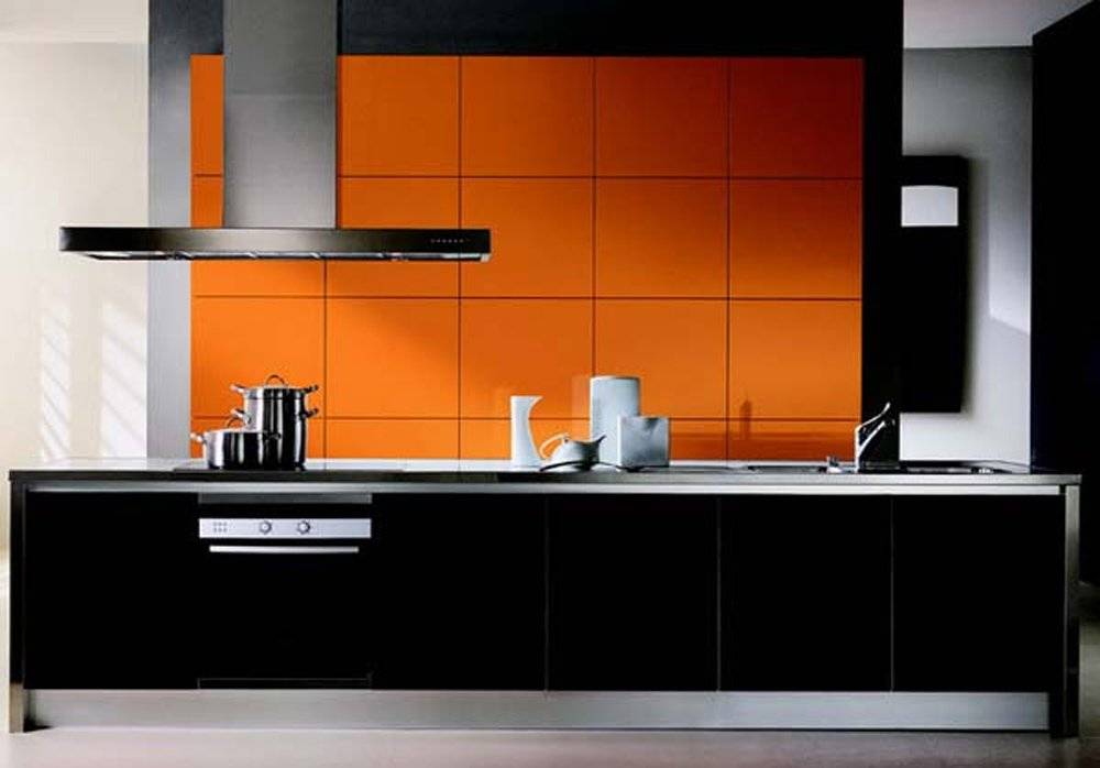 Черный цвет обладает способностью чуть приглушать бьющую через край энергетику соседа, а оранжевый, в свою очередь, сглаживает излишнюю строгость темного тона. Такой вариант отделки хорошо смотрится в средних и просторных помещениях. Для маленькой кухни использование черного в больших количествах нежелательно. Его следует применять в качестве незначительных вкраплений – бытовая техника, окантовка фасадов, столешницы. Также дизайнеры рекомендуют разбавлять черно-оранжевые кухни любых размеров с помощью белых поверхностей. Это могут быть обои, напольное покрытие, потолок, текстиль.