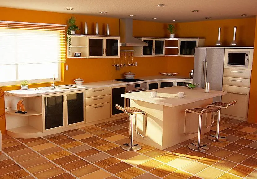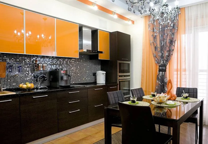Если оранжевые тона выбраны основным цветом, то при подборе кухни в первую очередь стоит обратить внимание, какая атмосфера на протяжение дня царит на кухне