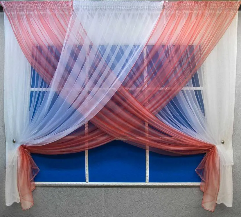 Перекрестная драпировка органзы разных оттенков с фиксацией подхватамиИсточник podborshtor.ru