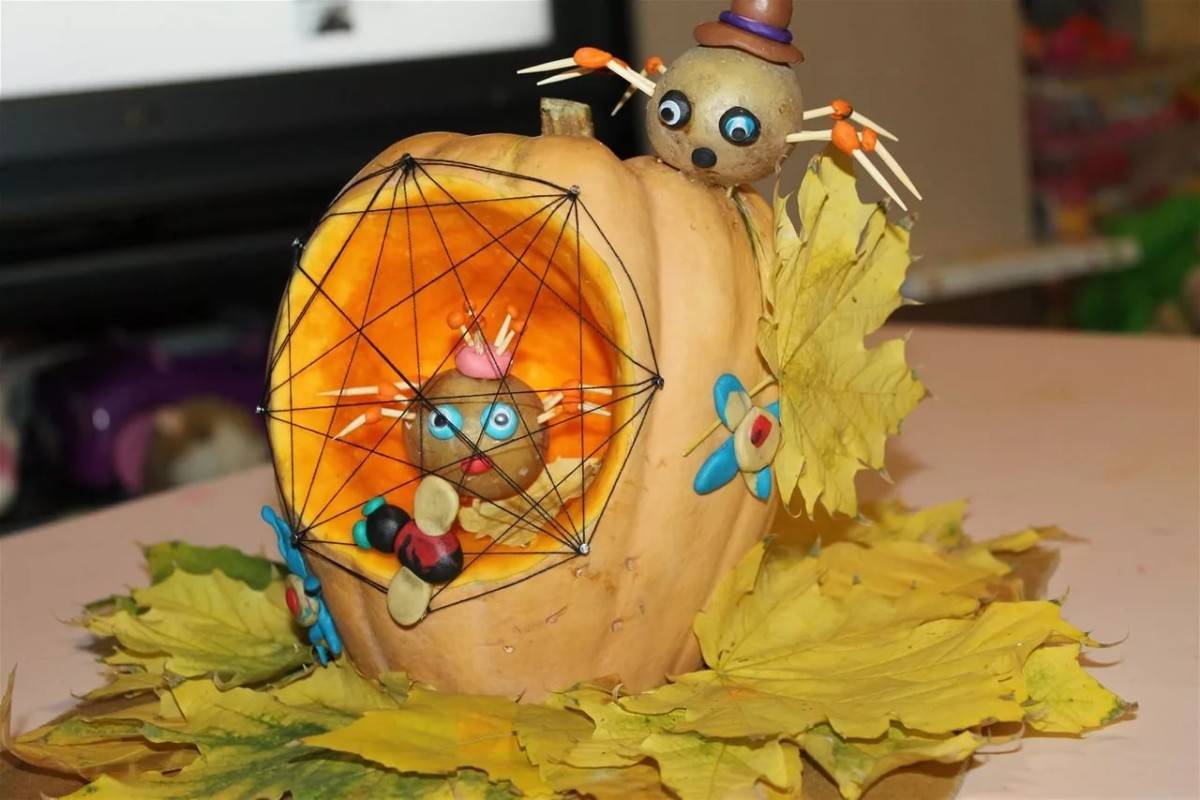Композиция из овощей требует уже определенный опыт. В этой работе используется нож, поэтому поделку нужно делать под строгим контролем старших. Для осенней тематики особенно красиво будет смотреться букет из разноцветных листьев в вазе из тыквы.