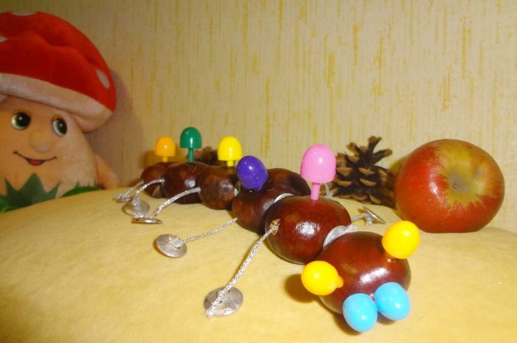 В собранных каштанах необходимо проделать шилом сквозные дырочки. Затем продеть гибкую проволоку через все задействованные плоды — самый большой каштан будет «головой», а самый маленький — «хвостом» гусеницы. На последнем каштане делаем небольшой узелок из проволоки, чтобы остальные не соскочили. На «голову» гусеницы приклеиваем глазки. Сверху головы нужно сделать два углубления для будущих рожек из зубочистки. Острую часть можно закрыть крохотным шариком из пластилина.