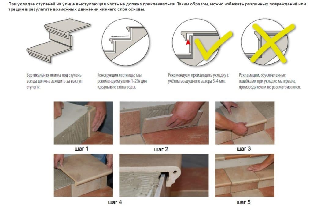 Монтаж керамики проводится, как и в случае с плиткой, на клеевой состав. При этом необходимо учитывать, что в первую очередь надо приклеивать ступени или подступени. Все зависит от конфигурации элементов. Если это просто плиты, то разницы никакой нет. Если монтаж проводится со специальным профилем, то сначала устанавливаются подступени, затем профиль и в последнюю очередь ступени. Читайте подробную инструкцию об отделке ступеней керамогранитом.