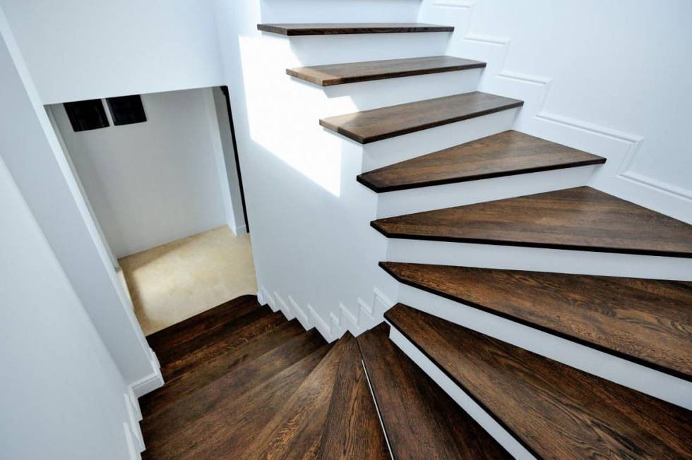 Такие ступени монтируются там, где происходит плавный поворот лестницы. От обычных элементы отличаются разной глубиной проступи: с краю широкая, к центру закругления более узкая. Винтовые лестницы полностью создаются из забежных ступеней.