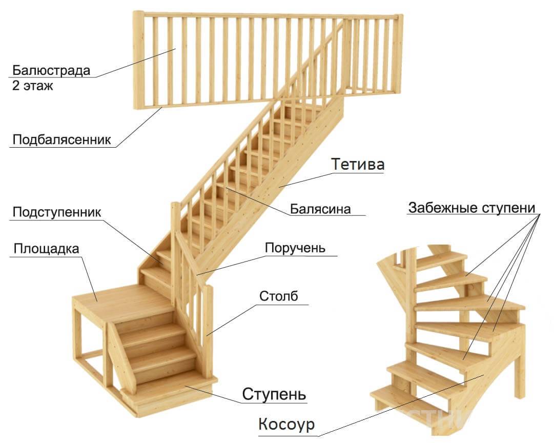 До того, как отделать бетонную лестницу древесиной, необходимо тщательно изучить конструкцию и основные элементы лестничного марша. Сама лестница предполагает простую конструкцию, но из-за обшивки древесиной добавляются определенные элементы. Из чего состоит конструкция лестницы: