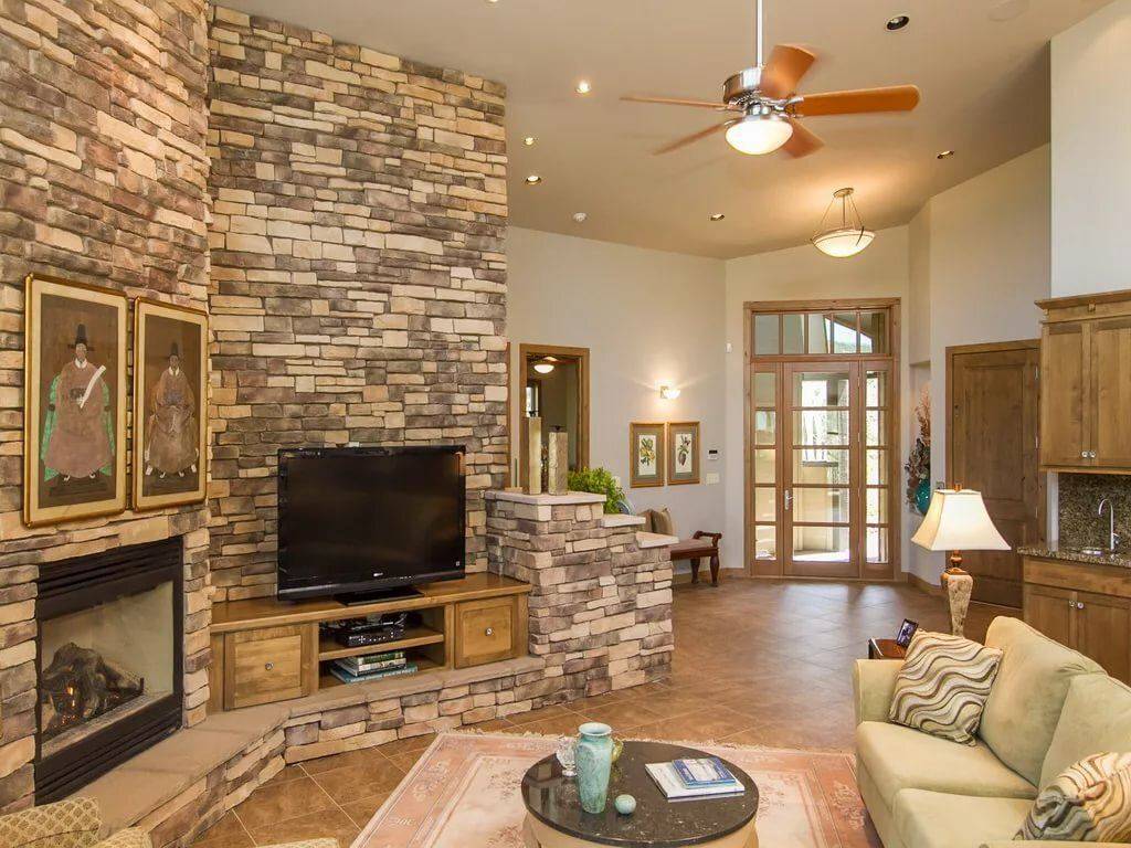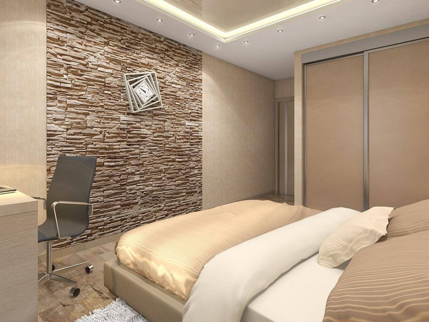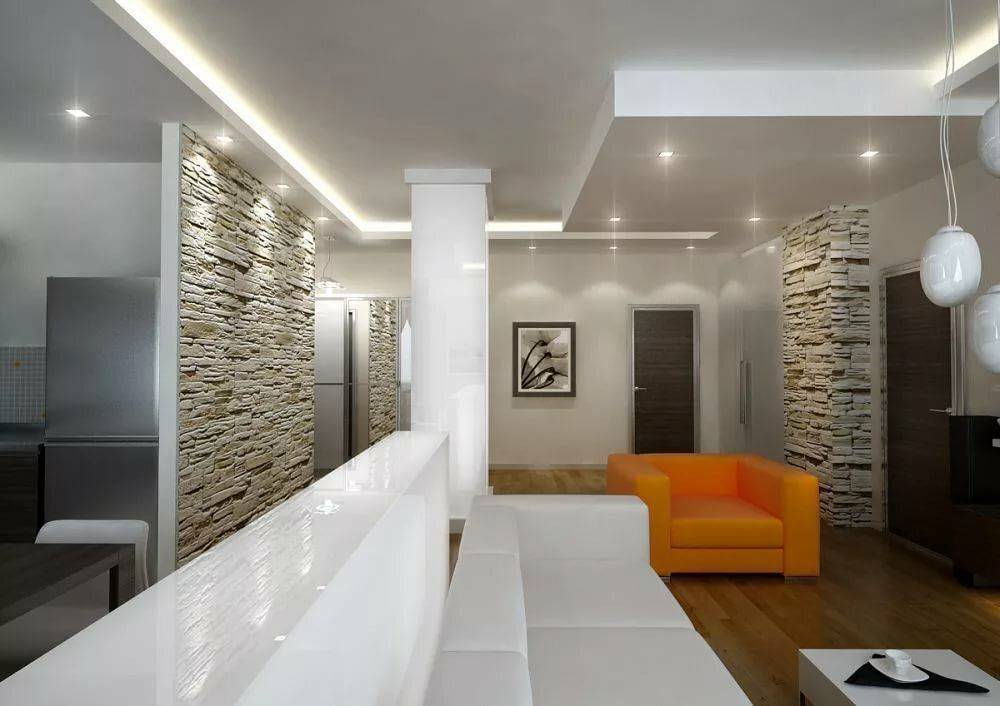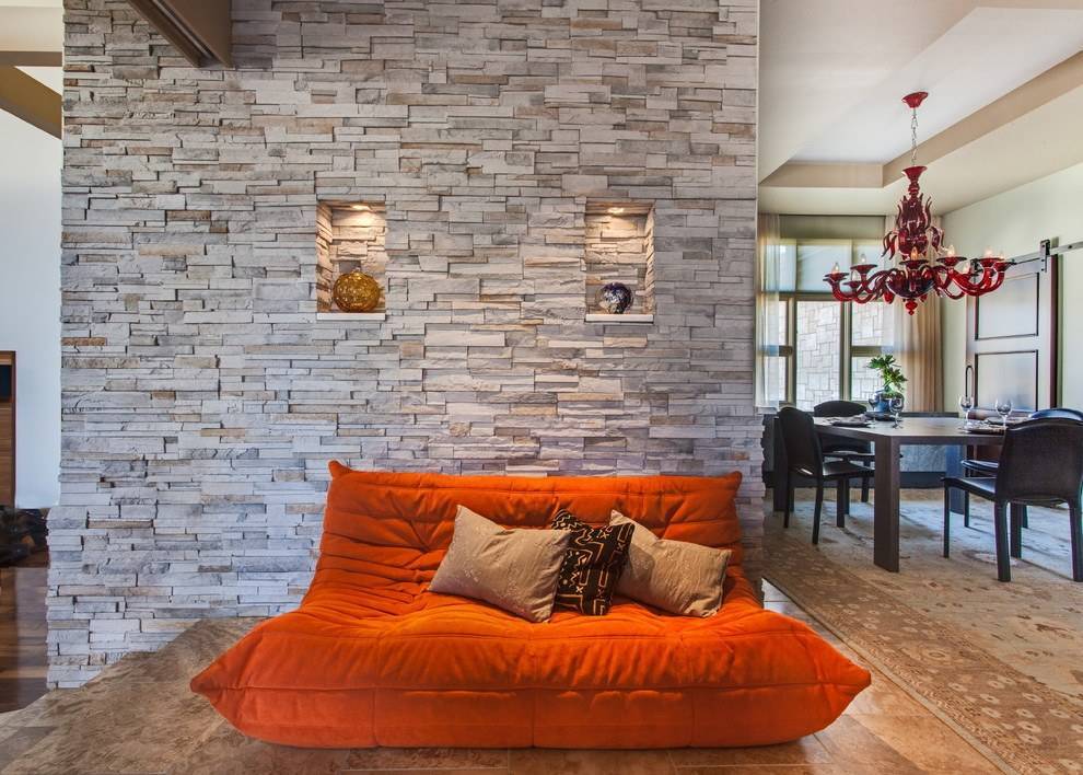 СоветПри покупке декоративного камня обратите внимание на его геометрию, отсутствие сквозных отверстий и отдельных фактур с размерами больше 5 мм. Зонируем гостиную и спальню в одной комнате (235+ Фото дизайнов): используем пространство с пользой и удобством
