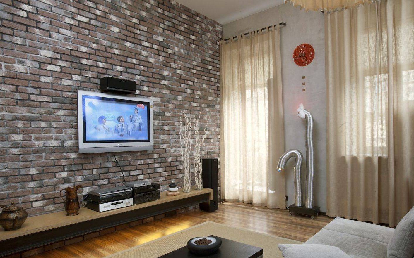 обои под состаренный кирпич в интерьере гостиной в стиле лофт