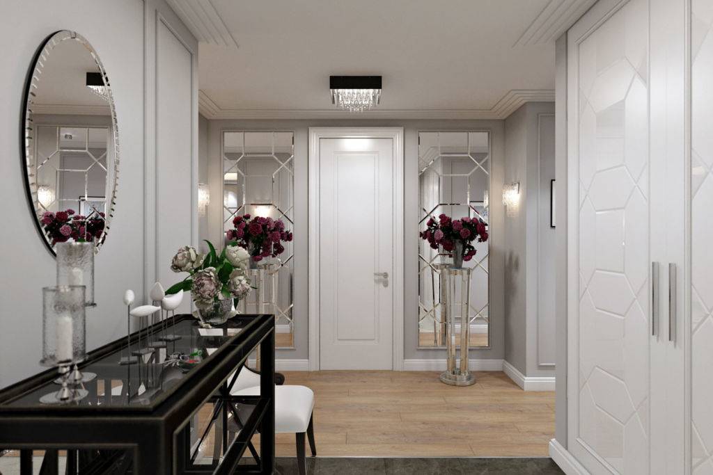 Проще всего работать с квадратом или не слишком длинным прямоугольником. С одной стороны от двери можно расположить встроенный шкаф, с другой — зеркало, вешалку с пуфом, этажерку или банкетку. Либо поставить всю мебель по одной стене, а вторую оставить практически пустой, добавив лишь немного декора или поставив красивое зеркало во весь рост.
