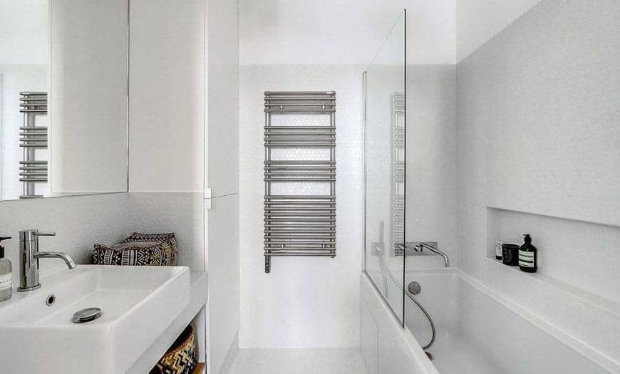 Разбавить белый цвет красным можно несколькими способами. Это может быть сантехника и мебель красного цвета, или наличие красной плитки в облицовке стен.