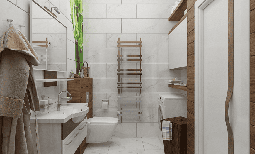 Помимо сантехники лучше отказаться от размещения в компактном туалете стиральной машинки и шкафов. Можно ограничиться настенным шкафчиком или полкой, нишей для хранения бумаги и чистящих средств.