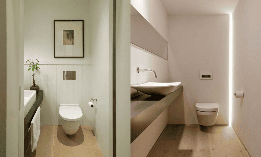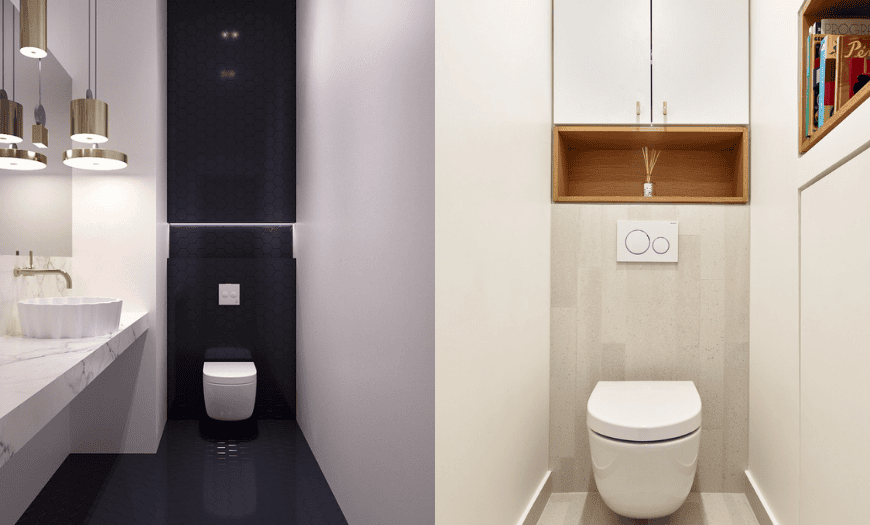 Дизайн туалета в стандартной квартире на фото слева выполнен с использованием нескольких приемов. Первый — горизонтальное деление дальней стены, которое визуально ее приближает. Второй — вертикальные полосы на боковых стенах, которые служат той же цели: сделать помещение более квадратным хотя бы визуально.