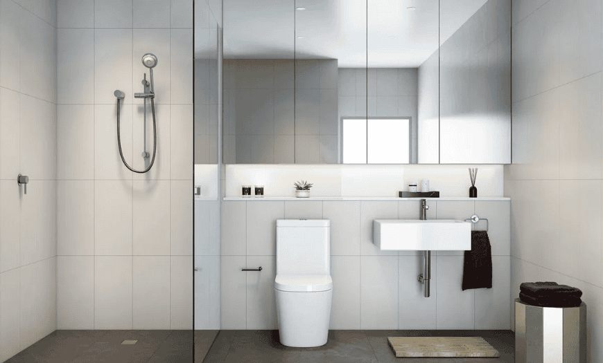 Шкафчики с зеркальными дверцами функциональны и визуально увеличивают пространство маленького санузла