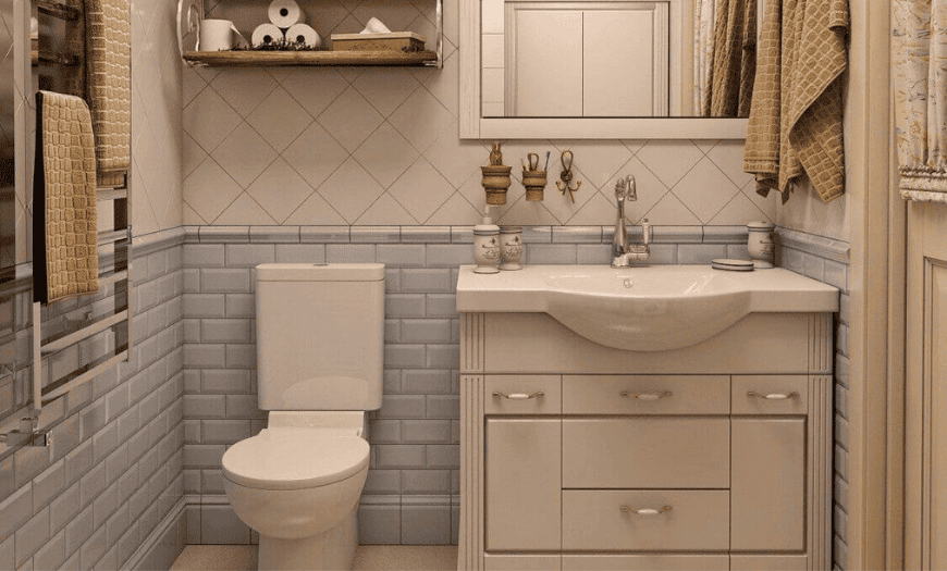 Нередко при обустройстве миниатюрного санузла специалисты прибегают к особому способу оформления стен. Они разделяют поверхность по горизонтали на две части, делая при этом своеобразный бордюр. Верхняя часть стены при этом оформляется в более светлом оттенке, чем нижняя. При использовании декоративного бордюра, его располагают на уровне глаз.