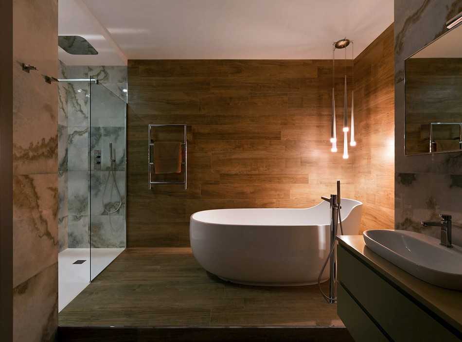 Для любителей шика и помпезности подойдет мраморная отделка ванной. Мрамор – это натуральный камень, который отличается низкой водопоглощаемостью и экологичностью. Мраморные стены в ванной комнате выглядят роскошно и дорого, однако и обойдутся они не дешево.