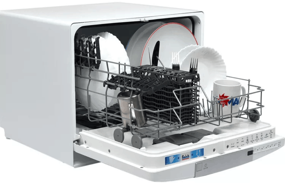 Портативные (настольные) – если полноразмерную машину нигде не поставить, выручит портативная мини-посудомойка, по размеру соизмеримая с микроволновкой. Она подключается к крану и размещается на столешнице. Вместимость такой малышки составляет 4-6 комплектов посуды. Для семьи из трех человек или, скажем, одного холостяка этого вполне хватает.