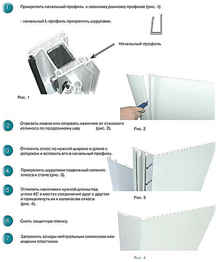 После установки верхней планки устанавливаются боковые планки с применением той же технологии. Последним этапом является герметизация швов (стыков) в углах откосов. Для этого применяют специализированные герметики.