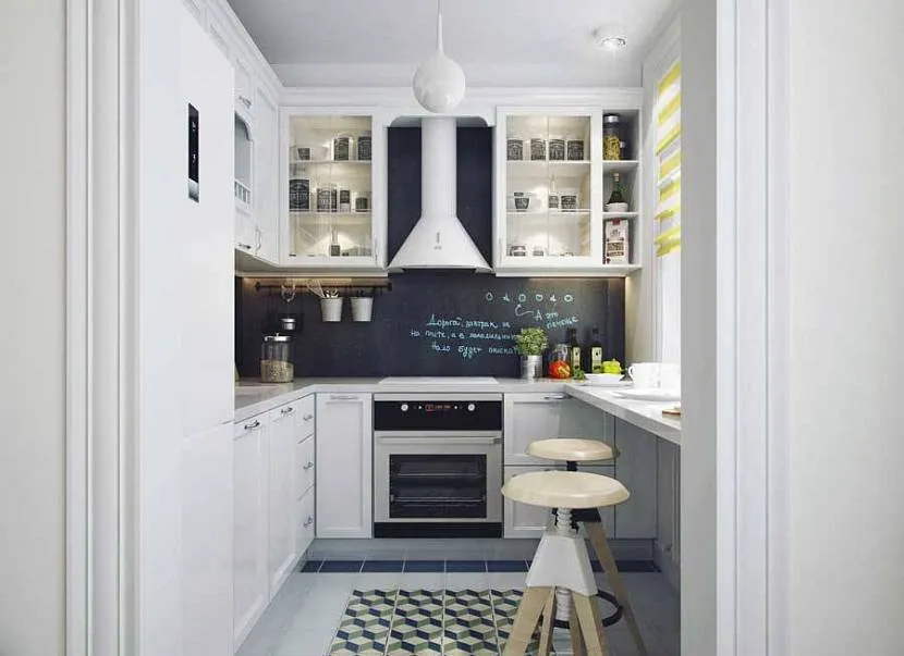 При выборе материалов, мебели и стилистики нужно учитывать размер кухни, сделать так, чтобы визуально увеличить пространство. Единственной такой возможностью является выбор светлых, нейтральных оттенков без крупных геометрических узоров.