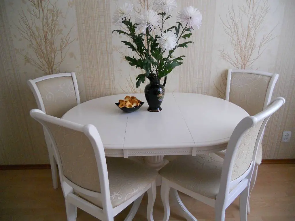 - в сложенном виде предмет служит обычным кухонным столиком, за которым удобно обедать в одиночестве. Но стоит появится гостям или праздничному поводу – и он моментально превращается в полноценный большой овальный стол для торжественных мероприятий.
