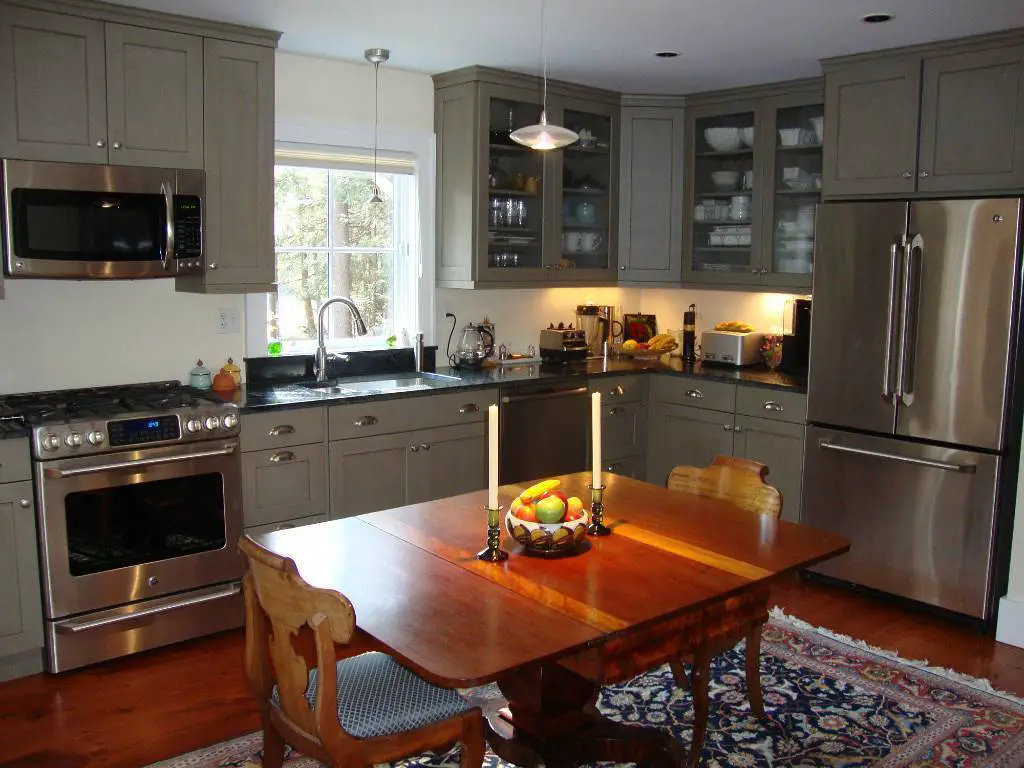 Просторное помещение позволяет поставить массивный кухонный стол любой формы. Большая кухня с прямоугольным или овальным столом в центре зала или возле стены, смотрится величественно и красиво. Небольшой семье с большой кухней будет приятно с утра выпить чай на диванчике, за поставленным перед ним столиком. А вот с маленьким столиком большая кухня будет казаться не просторной столовой, а пустой футбольной площадкой.