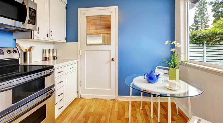 Наиболее часто в последние годы обеденные зоны в кухне (не в столовой, а именно в кухне, где зачастую не так уж и много свободного места) декорируют в бежевой, голубой, коричневой, кремовой, фиолетовой, зеленой, желтой гамме или даже в черном цвете. Красные тона на кухне использовать нежелательно, так как даже в приглушенном виде они слишком агрессивны.