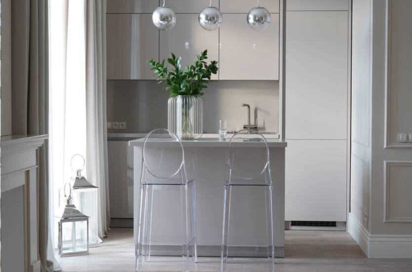 Минимализм. Для оформления стен используются обои, краска, декоративная штукатурка молочного, белого, бежевого цвета. В качестве дополнения подходит гарнитур из светлого дерева с глянцевыми фасадами персикового оттенка. Обеденный стол из стекла, цветного пластика. Форма лучше прямоугольная, круглая, овальная. Роль акцента могут сыграть римские шторы, фартук.