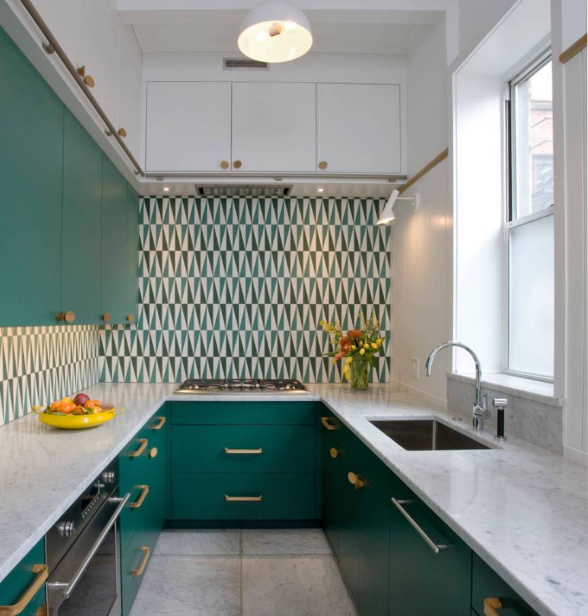 Гарнитур размещают вдоль трёх стен. Большое количество навесных и напольных модулей позволяет вместить в них многочисленную кухонную утварь. Пространство вдоль стены с окном обычно занимает рабочая поверхность. В помещении квадратной формы с таким типом планировки по центру может поместиться компактная обеденная группа. Дизайн кухни 10 кв. м прямоугольной продолговатой формы, вероятно, будет включать в себя только лишь один гарнитур. Столовую зону придётся переместить в другое помещение, например, в гостиную.