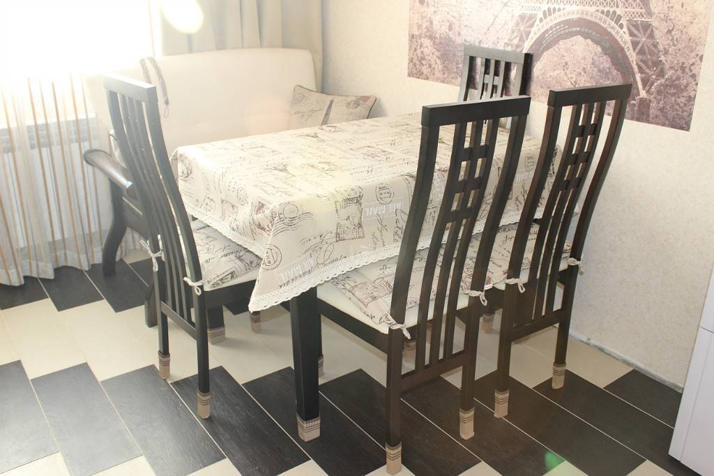 Прямо перед ним можно установить длинный обеденный стол. Со стороны стены рекомендуется установить диванчик такой же длины. Стулья, расположенные со стороны гарнитура, должны быть легкими, чтобы их можно было без особых усилий задвинуть под стол (так они не будут мешать при передвижении по кухне).
