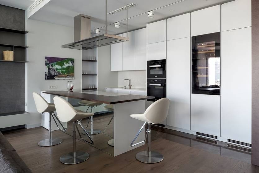 Белые фасады дополняют оригинальные стол и стулья под заказ. Мебель расставлена по П-образной схеме, и потому экономно использована площадь.