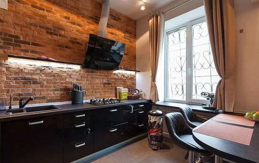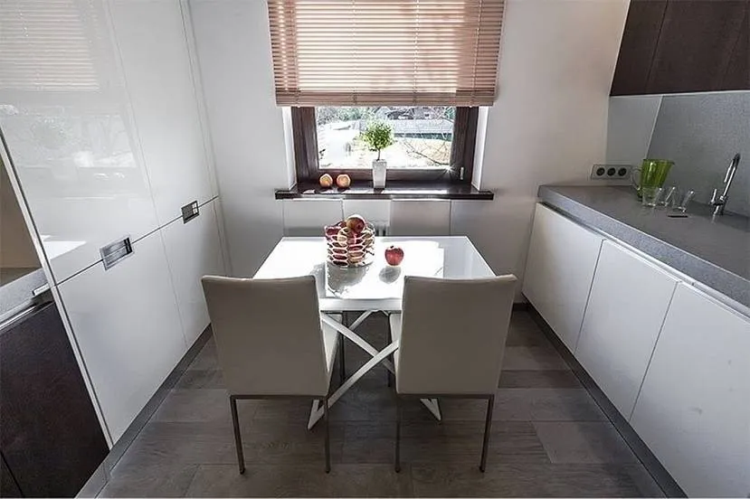 Идеальным вариантом станет барная стойка, навесная узкая столешница или мебель-трансформер. Подобное решение удобно, так как стол не занимает много места. В линейной и параллельной планировке лучшим местом для него является незанятая стенка с окном, где столешница заменяет собой подоконник. Если оставить достаточно свободного пространства между кухонным гарнитуром и перпендикулярной стенкой, можно удачно поместить маленький диванчик, оборудовав еще и зону отдыха. Даже в однорядной кухне можно с пользой использовать свободные стены, повесив съемную столешницу. И не нужно ставить громоздкие стулья: достаточно небольших табуреток, которые всегда можно спрятать под столик.