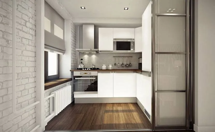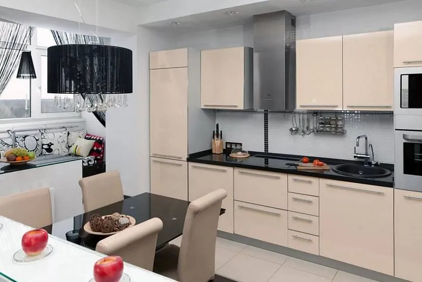 Если места не хватает, а кухня соседствует с незанятым балконом, утеплите его и сделайте обеденную зону там. Возможно, поместится даже небольшой диван. А если балкон достаточно велик, стоит «примерить» туда кухонный гарнитур, образец – на фото.