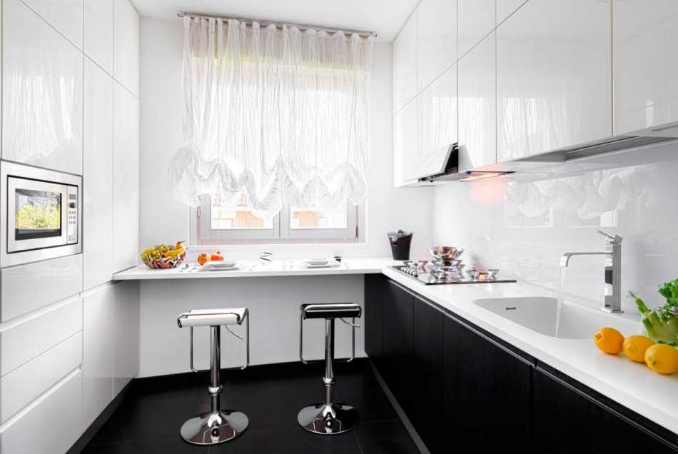 — Столешница у окна. Одну сторону гарнитура располагают вдоль стены с окном, устанавливая у подоконника барную стойку или небольшую столешницу.
