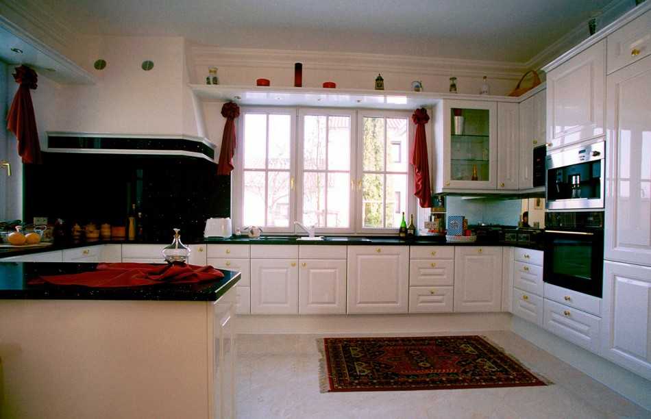 Размещение столешницы на подоконнике функционально использовать всю площадь. Беспрепятственно создать п-образную кухню с окном можно, когда его высота от пола 80-90 см, в других случаях необходимо учитывать перепад высот.