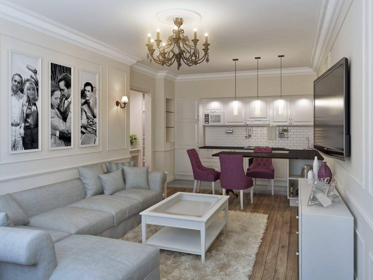 Единственный минус – невозможность сэкономить. Замена массивной и дорогой мебели на более дешевые аналоги из ДСП будет заметна сразу и испортит все впечатление. Компромиссом здесь может стать только смешение классики с элементами современного. Кухня-гостиная 20 кв м в стиле неоклассика допускает использование качественных аналогов из МДФ. Гарнитур и другая предметы обстановки могут быть более сдержанными, без резных элементов и других украшений.