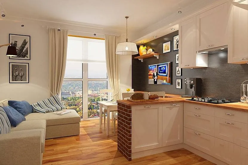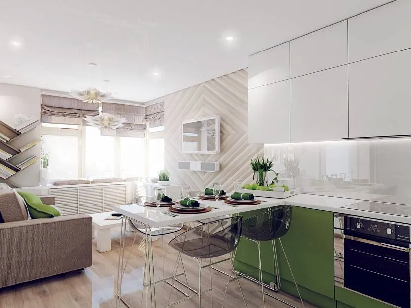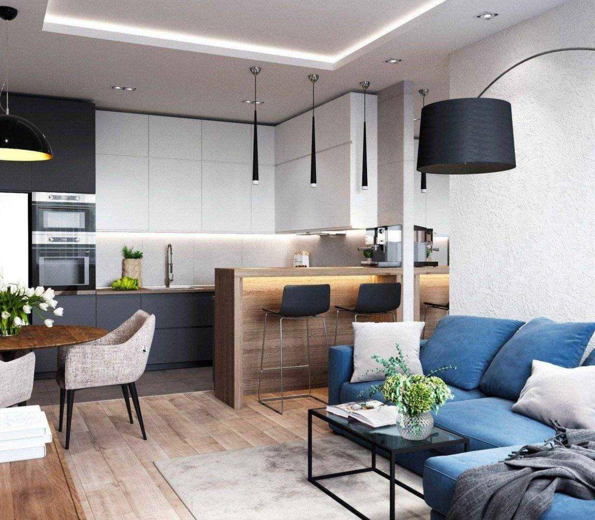 Обстановка кухни-гостиной 20 метров обычно включает следующие предметы: