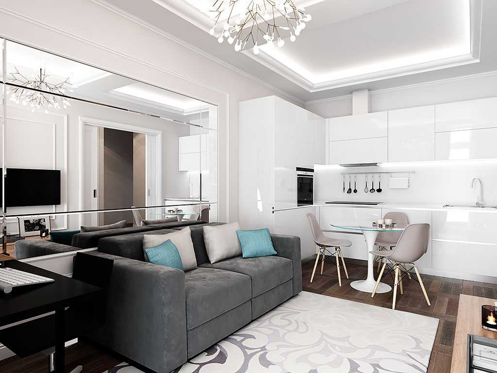 Минимализм. Лаконичный декор и ограниченное количество цветов делают этот стиль максимально подходящим для ограниченного пространства. За основу берут белый и черный цвета, а также оттенки серого и бежевого. Отделка стен однотонная, для визуального увеличения комнаты используются зеркальные и глянцевые поверхности. Чтобы интерьер не выглядел монотонным, допускаются яркие акценты в декоре и предметах интерьера.