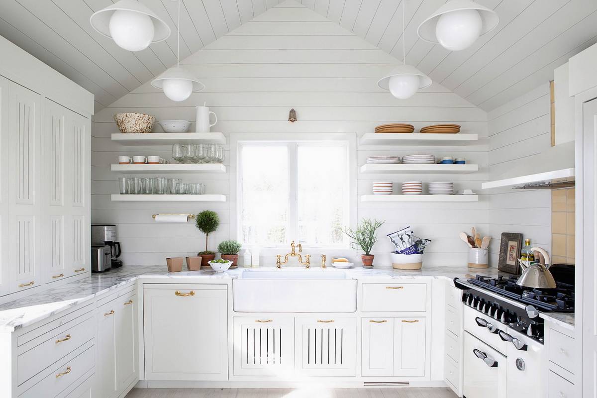Еще непривычная, но уже актуальная среди дизайнеров идея – Г-образное расположение с одной свободной стеной без антресоли. Так кухня кажется еще более просторной.