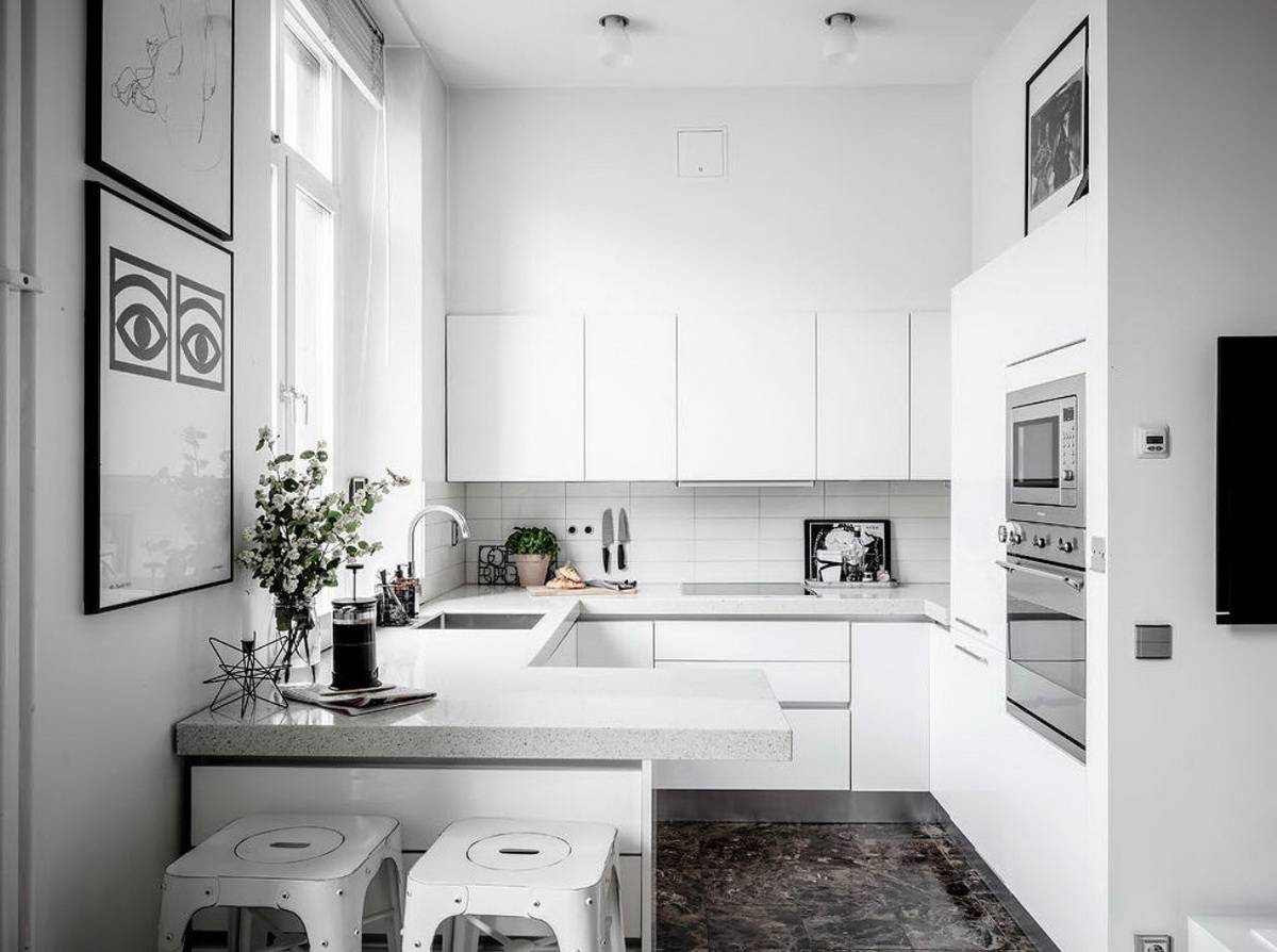 П-образная кухня для такой квартиры делается с неравными по длине полочками. Это даёт большее удобство прохода в зону приготовления пищи. На более длинной стороне располагается кухонная мебель, большие шкафы, варочная поверхность или плита, мойка, стиральная и посудомоечная машина. Короткая сторона — это стол для еды или барная стойка. Подход к ним выполняется почти всегда с другой от зоны приготовления пищи стороны.