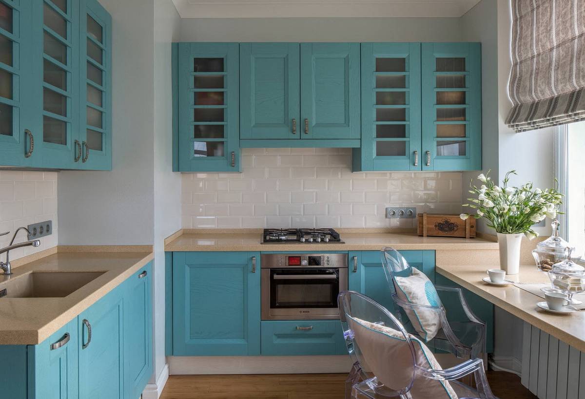 Если в кухне светлое покрытие стен, то гарнитур может быть ярко-красного цвета с серой столешницей, насыщенного синего в сопровождении светлых оттенков, травянисто-зеленого и других цветов.