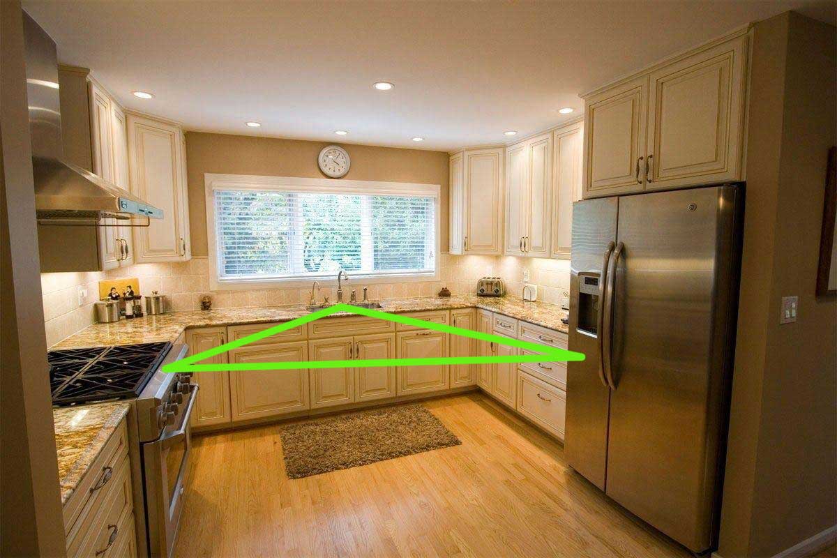 Обязательно расположите мойку, плиту и холодильник по трём сторонам. В этом случае зона хранения продуктов будет находиться в одном месте: рядом с холодильником стоит разместить навесные шкафы или пеналы, в которых размещаются сухие продукты, консервы, растительные масла, приправы. Над холодильником рекомендуется закрепить навесные шкафы до потолка, чтобы завершить картинку общего дизайна.