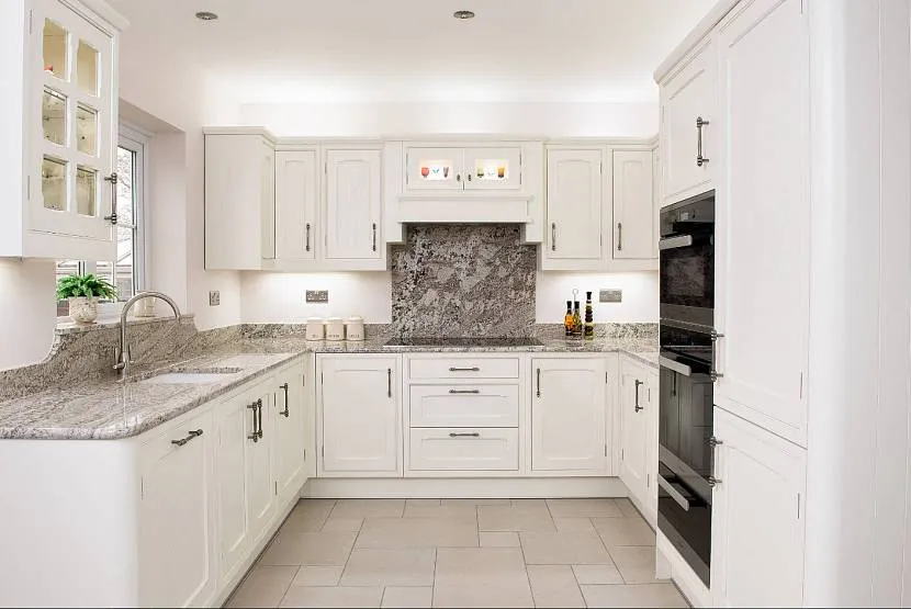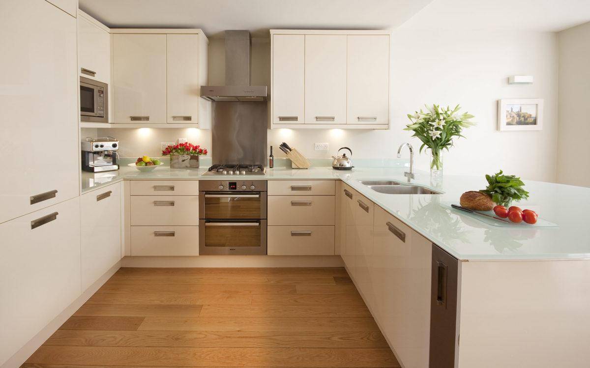Светлые тона (белый, светло-серый, молочный, бежевый) сделают П-образный гарнитур менее громоздким внутри.