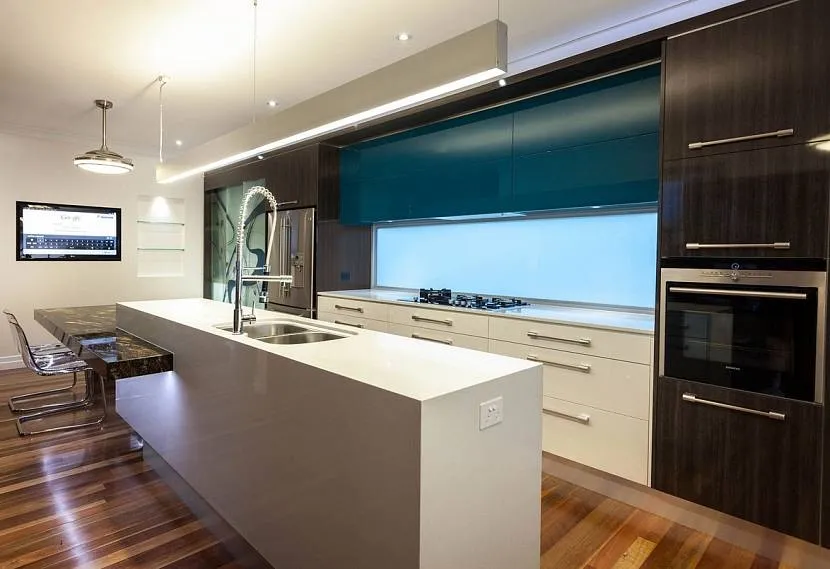 - Освещение. В П-образных планировках потолочного источника света не всегда хватает для качественного освещения помещения, поэтому его следует дополнять светодиодной подсветкой под шкафчиками, подвесными конструкциями с лампами, точечными лампами и бра.