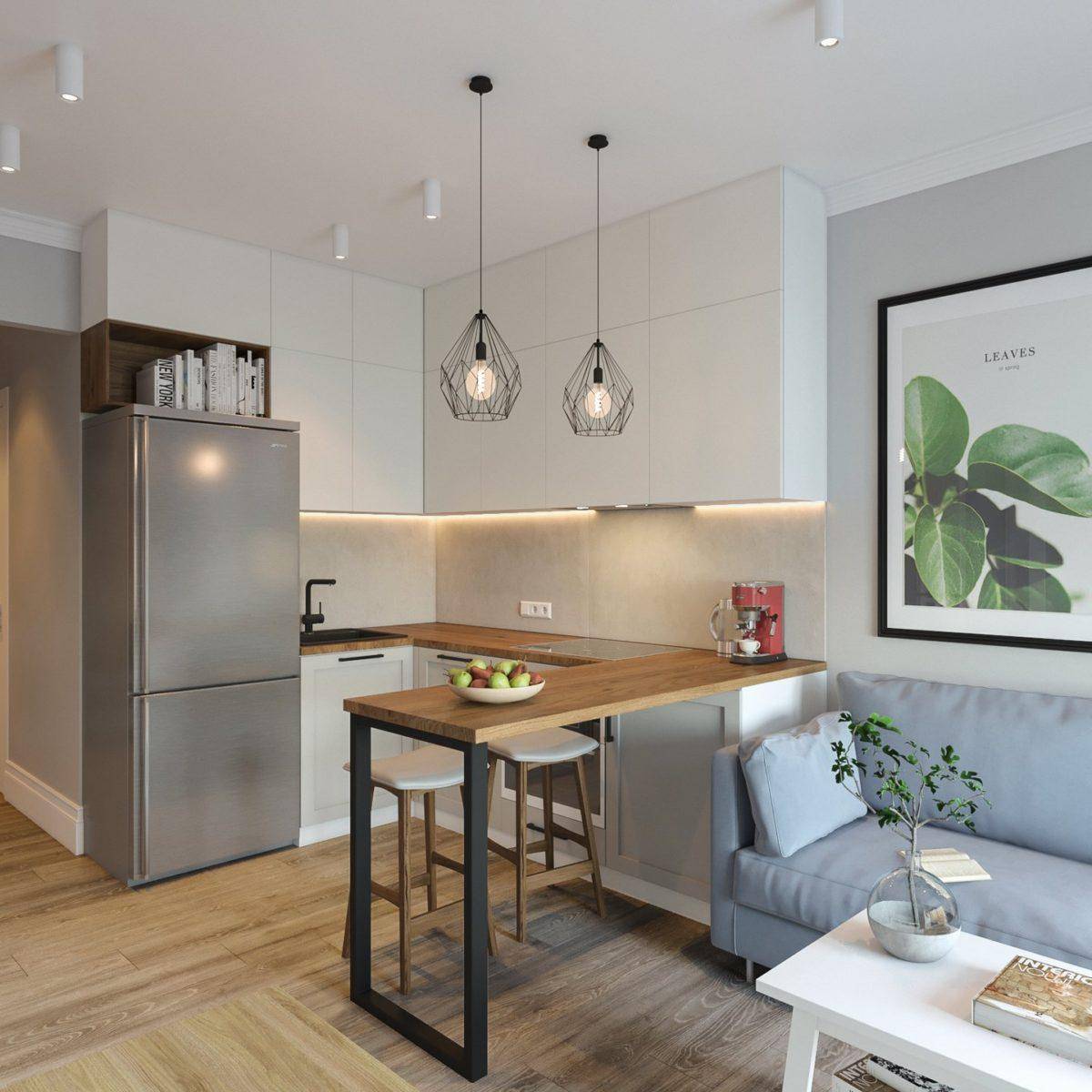 П-образная кухня с барной стойкой — лучшее решение, если необходимо сделать зонирование в студии.