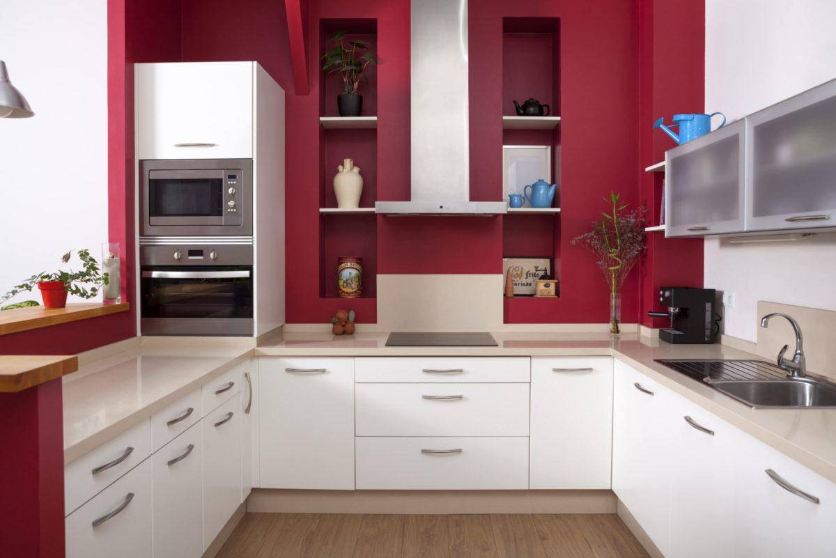 Обзор дизайна интерьера с яркой красно-белой кухни с угловым гарнитуром в видео: