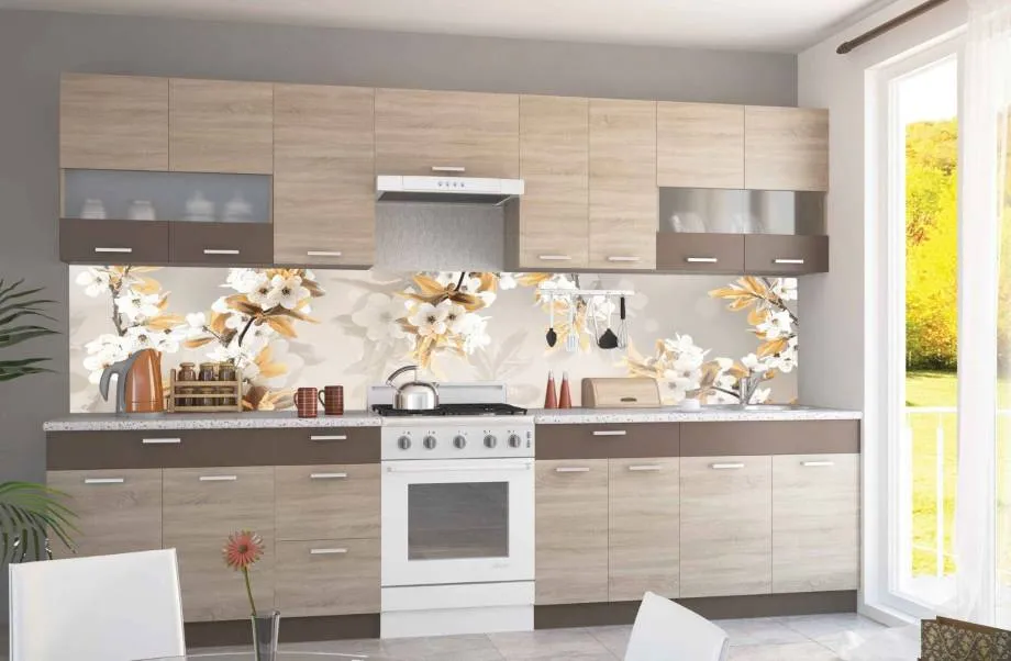 Стандартным считается расстояние от столешницы до шкафов в 60 см, от плиты до вытяжки 75-80 см. Размеры же стандартных фартуков не соответствуют вышеуказанным, обычно это 60 на 300 см. Поэтому придется закрывать стену кухни двумя панелями, а это значит что будет стык, который нужно будет маскировать.
