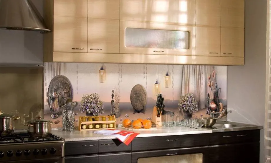 Экономным решением для любого фартука ─ как из пластика, ХДФ, так и из стекла ─ является пленочный способ переноса изображения. Для этого рисунок печатается на пленочной основе, которая затем наклеивается на любую поверхность. Конечно, эстетичнее всего такое фото смотрится именно на скинали, потому что ХДФ или пластик имеют другой фон, поэтому краски даже на пленке в итоге ложатся иначе.