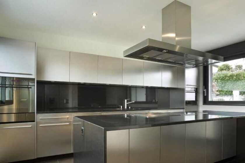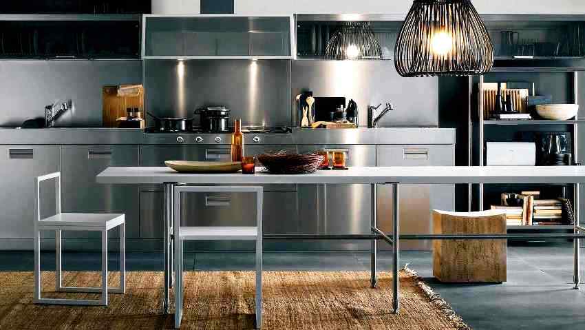 Новейшая идея, которая пришла в голову дизайнерам. Подходит для дорогих интерьеров в современном стиле, к примеру хай-тек. Обычно металлическая панель закрывает зону готовки, становясь главным акцентом помещения.