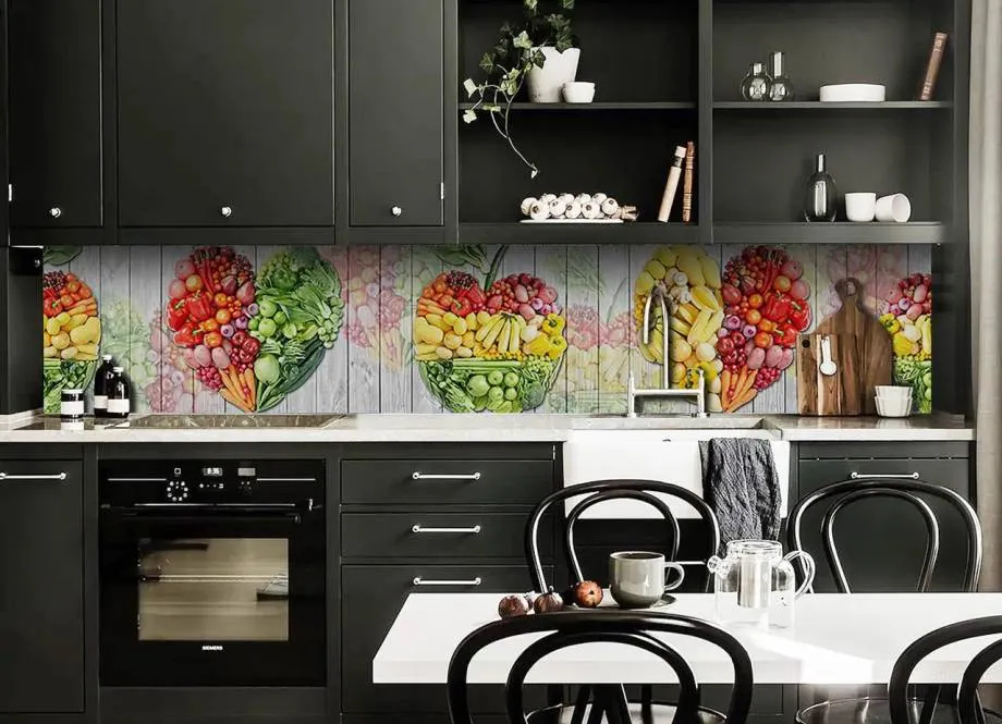 На строительном рынке можно найти множество разнообразных решений. Некоторые предпочитают выбирать панели в цвет столешницы под дерево или камень, либо с фоторисунком. Самые популярные изображения — цветы, натюрморты и мегаполис. Необычно смотрятся модели под натуральный кирпич.